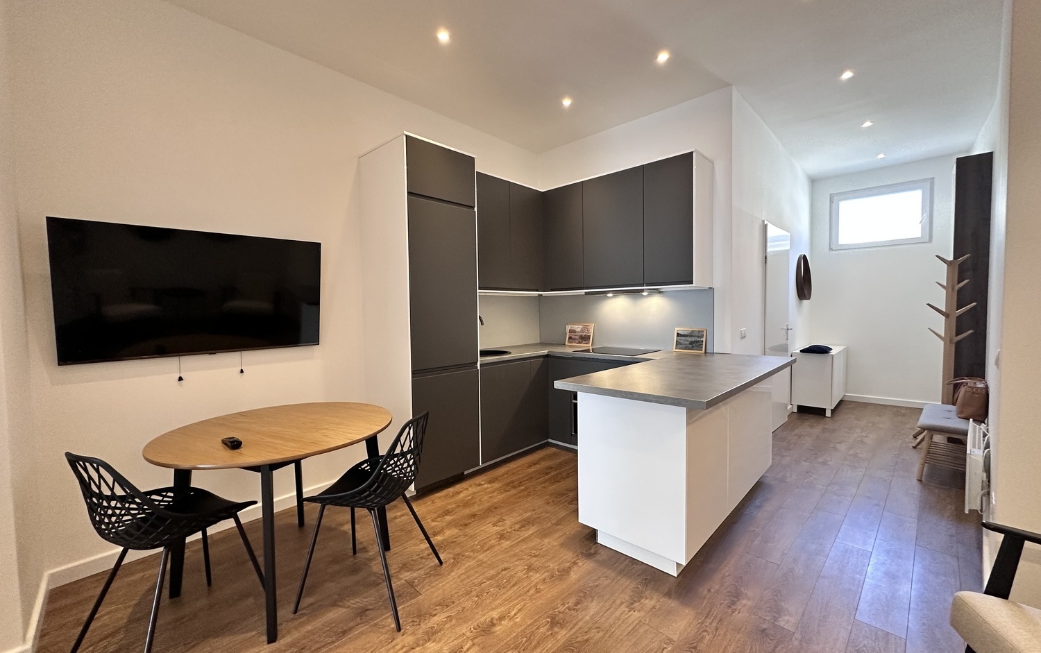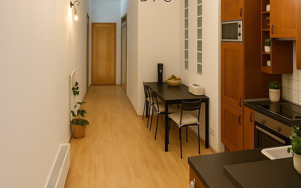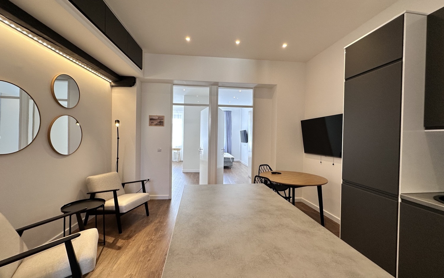 District VI • 58 m² • street view • 2 bedrooms • 1 bathroom • living room with American kitchen.