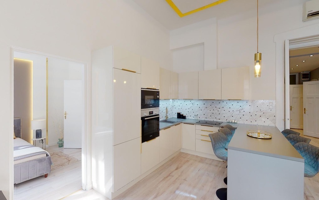 District VI • 2nd floor • 90 m² • street view • 2 bedrooms • 2 bathrooms • living room • detached kitchen